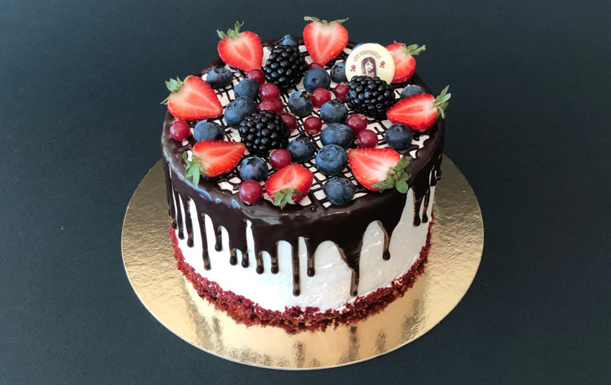 Põhjaks hele biskviit, täidiseks purustatud maasikad ja kohupiimakreem krõpsuva täidisega (valge šokolaad, mandlid ja krõbe küpsis). Kaunistatud marjadega.