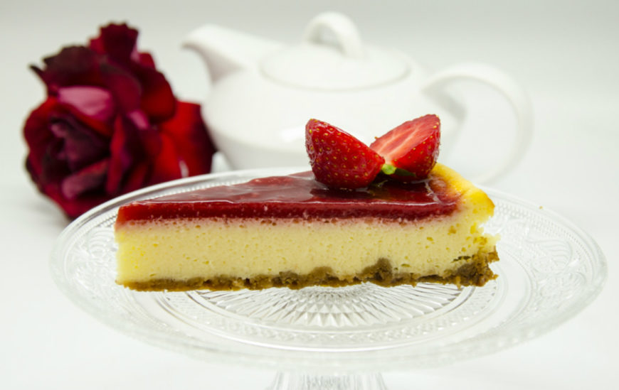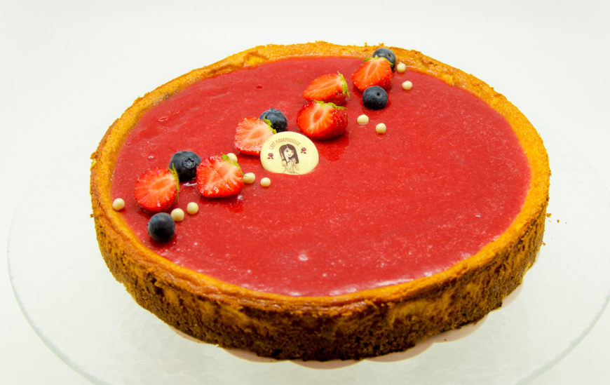 Põhi Digestive küpsiste ja pähklitega, peal küpsetatud segu toorjuustust ja valgest šokolaadist, kaetud naturaalse maasikapüreega. Kaunistatud maasikatega.