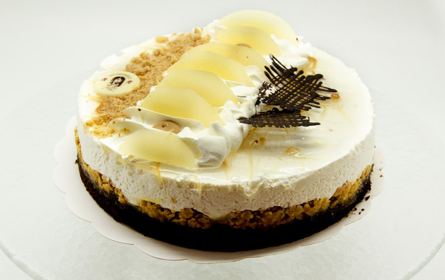 Moonibiskviitpõhi, täidiseks pirni – hapukoorekreem, kaetud šokolaadiglasuuri ja vahvlipuruga. Kaunistuseks soolakaramell ja pirnid.