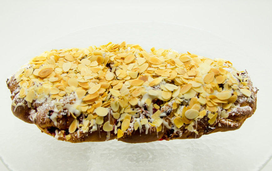 Pärmitaigen rosinatega, vaniljekreemitäidis fariinisuhkruga, külmutatud pohlad, kaetud pähklilaastude ja valge šokolaadi glasuuriga.